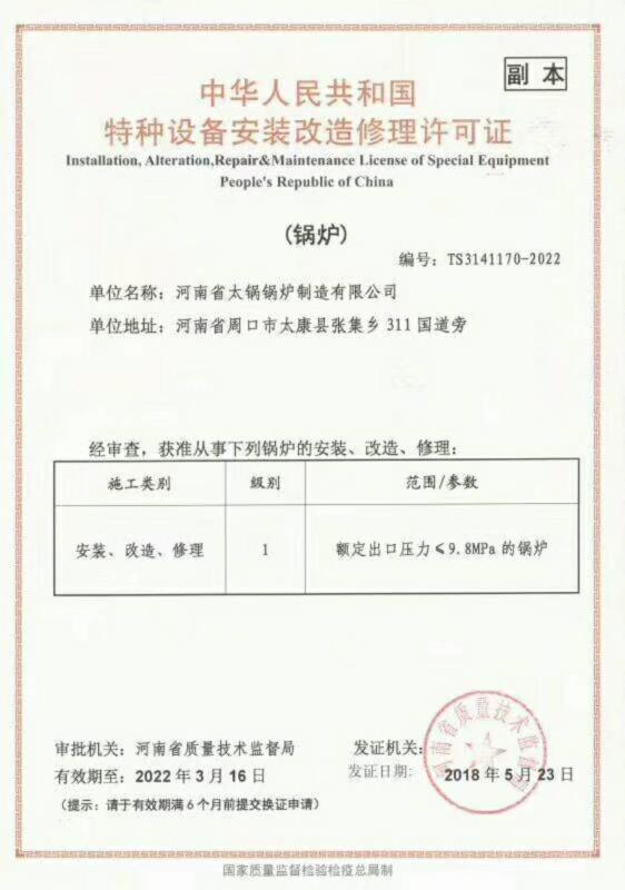 河南省太鍋鍋爐制造有限公司(原河南省太康鍋爐廠始建于1976年)始建于70年代初,經(jīng)40多年的艱辛探索,靠科技興業(yè),走科學(xué)管理之路,現(xiàn)已發(fā)展成為承接制造、安裝、設(shè)計大、中型供熱系統(tǒng),生產(chǎn):SZS燃油燃?xì)庹羝仩t、燃煤蒸汽鍋爐、燃油鍋爐、燃?xì)忮仩t、電加熱鍋爐、生物質(zhì)鍋爐、茶水鍋爐、有機熱載體鍋爐、熱風(fēng)鍋爐,蒸壓釜、燃油蒸汽鍋爐、燃?xì)庹羝仩t、燃油熱水鍋爐、燃?xì)鉄崴仩t并承擔(dān)安裝120噸熱水鍋爐、蒸汽鍋爐,生物質(zhì)鍋爐,加工制造一、二類蒸壓釜、壓力容器,化工機械的省一級**企業(yè)。